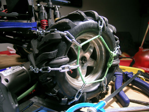 El montaje. ¡Cuidado que pincha! Partiendo de 4 neumáticos originales Emaxx usados, tirafondos de 3*12 mm, un atornillador eléctrico, y las cadenas que hice el año pasado se puede apañar este invento. Hay también unas tiras y ángulos de caucho algo más densos que la goma original pegados con Loctite, algunos incluso atornillados, al nervio. No hace falta que el dibujo sea regular, en nieve da igual no es muy importante . Y sobre hielo es suficiente con que al menos dos o tres clavos estén tocando el hielo. En esta imagen se ven tres tornillos que cuando pasen por abajo y con la deformación del neumático se clavaran en el hielo, al menos eso espero. Pues eso, cuidado que pincha, es muy fácil clavarse alguno durante el montaje de las neumáticos, cadenas o al pegar en las llantas. De relleno lleva las esponjas originales del Emaxx pero muy recortadas de forma que el neumático se deforma y aplana al andar. Estas esponjas originales tienen una calidad superior a otros fabricantes, pues incluso en contacto prolongado con humedad dentro del neumático no se pudren. |
