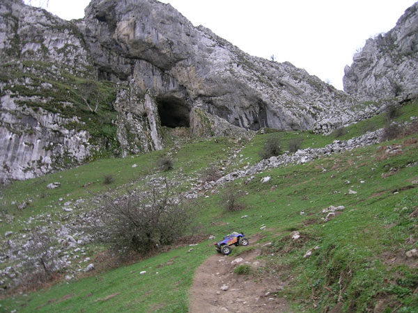 Cerca del túnel de San Adrián. En la misma pendiente que la anterior foto, nos acercamos al camino "fácil”, la otra variante ancha y transitada que discurre allá arriba al lado de la pared hasta la entrada de la cueva que comunica con el otro valle... Aquí el camino directo permite un poco de descanso regalando alguna Ese en el trazado. La verdad es que después de pasar por trechos mucho más empinados estos últimos metros hasta el túnel es mejor subirlos directamente por la hierba, pasando del camino y procurando no erosionar el terreno, cosa bien sencilla además para el Emaxx si no se le da al gatillo. Esta enorme cueva se alza casi a 1000 metros de altitud y es uno de los pocos pasos naturales de estas tierras entre Navarra y Guipúzcoa. El sendero tiene un origen antiquísimo y pasado el túnel sigue una antigua calzada romana, parcialmente conservada.