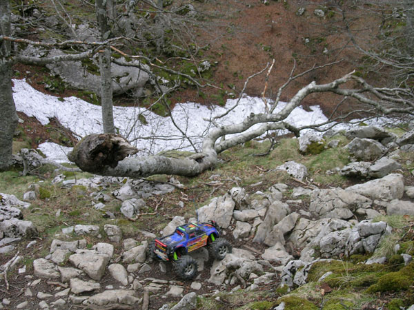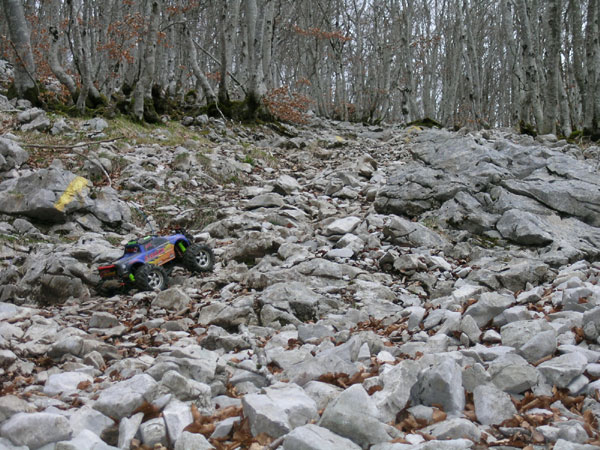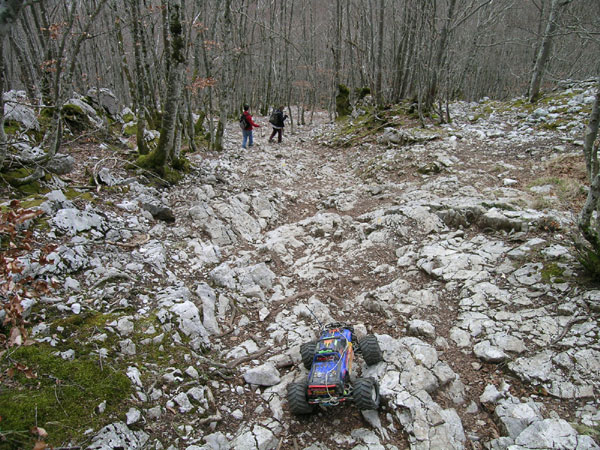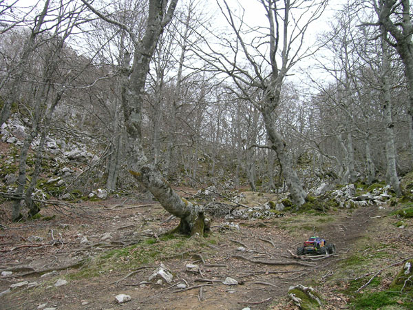Si te aburren las piedras no debes seguir. Esa amenaza en forma de sendero de la anterior foto se convierte en promesa y más tarde eres tu el que juras en arameo. Venga que en el fondo me gusta... repito para consolarme. Esto sube aun más que al principio, y de vez en cuando se intercalan pasillos que superan los 40 grados, por suerte muy cortos. ¡Vamos! Las marcas amarillas muy abundantes y necesarias en caso de niebla apenas se distinguen en esta foto, hay una hacia la mitad a la izquierda del camino y otra a la derecha de él junto a la entrad del bosque, no es difícil ver como está la cosa. El Emaxx sube esto sin inmutarse. Ni un solo fallo en la transmisión, radio, motores ni servos. Subo todo en primera con la relación 12/72 y la mejor de mis baterías. Si no puede escalar salta y si no puede saltar lo rodea., Y si dudas como subir ya sabes, el viejo truco: cierras los ojos metes primera y gatillo a fondo. Es imparable. Cuidado, esto no significa que a estas alturas no sea necesario de vez un cuando un toque de turbo en el trasero, incluso algunas zancadas con el coche colgado del brazo, pero son situaciones muy esporádicas que se hacen más por comodidad que por necesidad. Esto parece no acabar nunca. El espléndido bosque de hayas y avellanos empieza a cansarme y siento necesidad de llegar a algún lugar despejado, con más luz. Llevamos más de media hora sin saber donde termina esto subiendo, subiendo, subiendo y piedra tras piedra sin ver el final