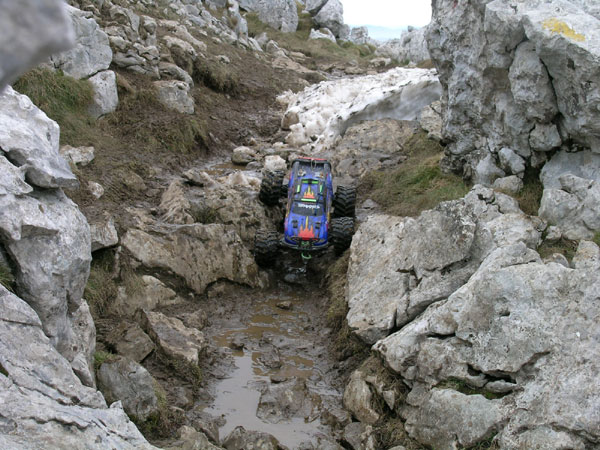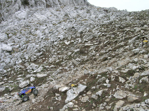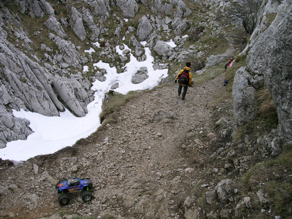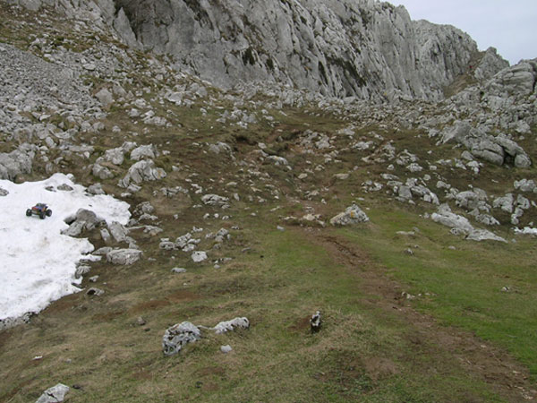 La bajada ,de regreso. No os penseis que aquí tuvo un pequeño accidente el Emaxx, se quedó así en un escalón y le saqué esta foto. Fijaros que ya no lleva esa cuerda atada detrás. El primer tramo de bajada desde el Aizkorri y parte de la travesía entre los dos collados la hice con la cuerda de seguridad atada a mi cinto. Se baja más cómodo, mucho más rápido y sobretodo, sin ninguna preocupación por que el coche pueda volcar en el descenso. En varias ocasiones durante esta bajada el coche va a volcar dejando el trasero por delante y panza arriba y el cordel de seguridad se lo impide. .El que si tropezó varias veces fui yo - más que nada para no perder la tradición de las últimas salidas - aunque espero que sin consecuencias importantes. La bajada, habiendo visto fotos de la subida es fácil imaginar como es, nada cómoda, no demasiados metros para andar mirando al horizonte y larga. Se intercambiaron arriba los anillos de precarga, dejando para estas "grandes pendientes" dos anillos de los gordos en cada uno de los cuatro amortiguadores delanteros y ninguno en el trasero - sólo unos muy finos - . Una auténtica pasada totalmente inconducible en llano.