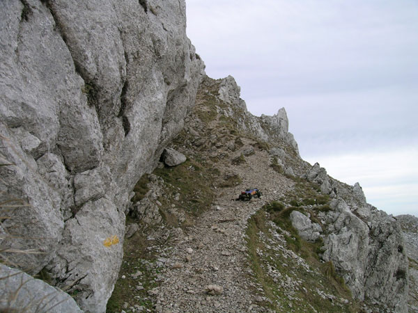 Cuidado con el Diferenc...CRACK. Que nooo, que es una broma. Se parte aquí el diferencial a tres horas de camino de regreso y me da algo. Aquí el diferencial estaba recién reparado después de partir los cuatro tornillos de la campana en el descenso de la ruta VII [ el Ernio] . El semieje entre el diferencial y caja de cambios continua retorcido unos 25 grados desde esa rotura e increíblemente aguanta como el mejor de los CVD’S. En estos ultimas zonas antes de la cima se llanea algo, se sube se baja y nos vamos acercando a la fuerte subida final, un apiñamiento de rocas erosionadas por todas partes y que a duras penas se sostienen una a otra. En esta posición, con una rueda delantera prácticamente clavada y amortiguador comprimido es fácil romper un semieje de la transmisión si no hemos sustituido los estándar por otros más traleros y resistentes de acero.
