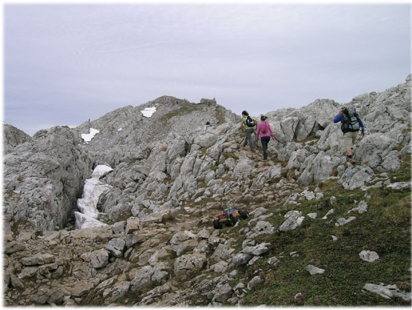 El terreno a partir de 1450 metros es un laberinto kárstico, lleno de grietas, oquedades con agua, pasillos y bloques en los que para avanzar es necesario ayudarse con las manos o buscar apoyos. No es terreno que guste al Emaxx, ni a un Crawler siquiera. A partir del collado que se ve cercano al Aitzonto, es pura cresta de rocas. Se pasa pero es difícil y se suceden tantos lugares para el desánimo como zonas magníficas.
