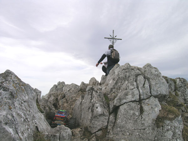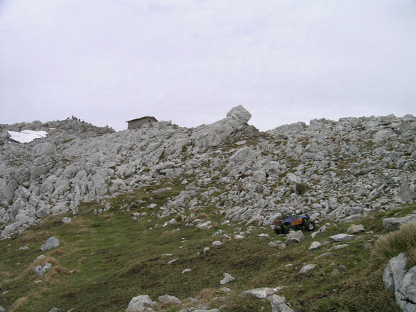 El desánimo. Desde que se puso la primera batería se pasa ese segundo puerto que mostraba la anterior foto. Tras un pequeño descanso sobre praderas, nos encontramos con este murallón. Un punto azul claro en la pared es un tío subiendo y lo tengo a 15 pasos como máximo, un poco más arriba hay otro que se gira. Pero aquí ya no sirven las ruedas, ni las de los Crawlers me atrevería a decir. Esto es pared pura y dura con piedras de dos palmos incrustadas en una pendiente de 35º, con escalones de un metro. Algunos suben ayudándose con la manos o buscando apoyo en los bloques más grandes. La zona termina allí arriba, a la izquierda de esa peña inclinada. Andando no llega ni a 5 minutos. Me desanimo un poco. Toda la ilusión por llegar arriba y ser casi sin lugar a dudas el primero que sube un coche RC hasta la cruz, se desvanece en estas dificultades. No me gusta. No me agrada colgarme el coche y tener que dar más de veinticinco zancadas para superar una zona, y esta las necesita, no muchas más pero deben hacerse. No menos de 10 veces en esta subida tienes que coger el Emaxx y despegarlo del suelo. Sabiendo que apenas quedan 100 metros de desnivel me decido a subir el coche. Ya no hay vuelta atrás, si se queda sin baterías bajo con el coche colgado de la mochila hasta el aparcamiento.