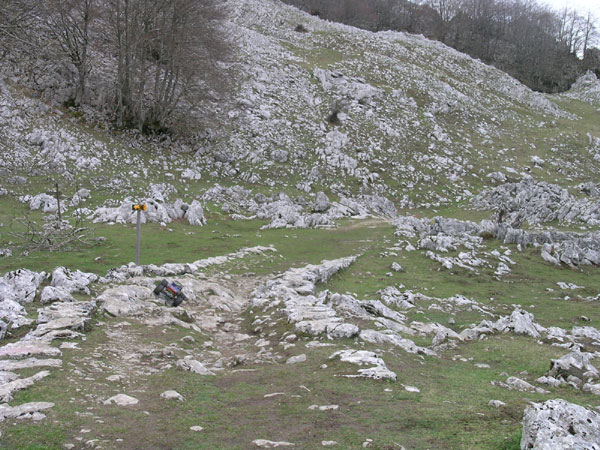 Indicador al Aizkorri. Nada más pasar el túnel llegamos a una vaguada con una orografía bien diferente a la de la otra vertiente. [Esta foto está tomada al regreso, la cueva quedaría al fondo, no detrás nuestro]. Estamos en medio de una antigua calzada romana y se ve perfectamente el antiguo trazado de vía romana hacia la cueva, al final de este llano y algo a su derecha. ¿Veis esa pendiente todo piedra frente al coche? Pues ya mismo firmaría subir por ahí diez veces una vez visto el camino al Aizkorri que señala esa flecha hacia la izquierda de la imagen. El camino al Aizkorri que se inicia en este punto parece trazado dentro de un bosque que alguien colgó de una pared. Aquí es uno de los lugares en que no debes pararte a pensar ni un segundo si deberías continuar con el coche haciendo el burro , así que vamos a toda prisa para arriba antes de arrepentirnos ... Por que no me quedaría yo aquí todo el día dando saltos con el Emaxx y preparando una ricas costillas de cordero al fuego ? A pie es una subida sin un minuto de descanso. Con coche es casi una hora sin un solo metro donde poner la segunda marcha y en los que se cepilla un pack y medio enteros exigiéndoles además toda su potencia.