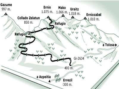 Aizkorri, una de las grandes y legendarias montañas de Guipúzcoa. Le superan en altitud sólo un par de cimas en el mismo macizo mismo cordal, a muy poca distancia y por escasos 20 metros. Esta ruta se inicia a 800 metros de altitud y salvando un desnivel de 730 metros debe llevarnos hasta la cumbre del Aizkorri. Es el mayor desnivel que he probado a superar con el Emaxx, y si se consigue va a necesitar los seis dobles pack de baterías de 3000 mah apurados hasta que no se mueva ni un solo electrón. Cuatro juegos para la subida, - calculo unos 200 m de desnivel por Pack- y dos más para la bajada. Eso supondrá estar unas 4 horas largas, casi cinco al mando del coche si contamos paradas para cambios, fotos y algún descanso. Viendo el perfil de este itinerario y no habiendo subido nunca anteriormente, ni siquiera a pie, tengo pocas esperanzas de llegar a la cima. No conozco además la orografía de esta zona.