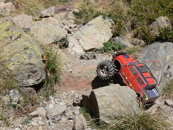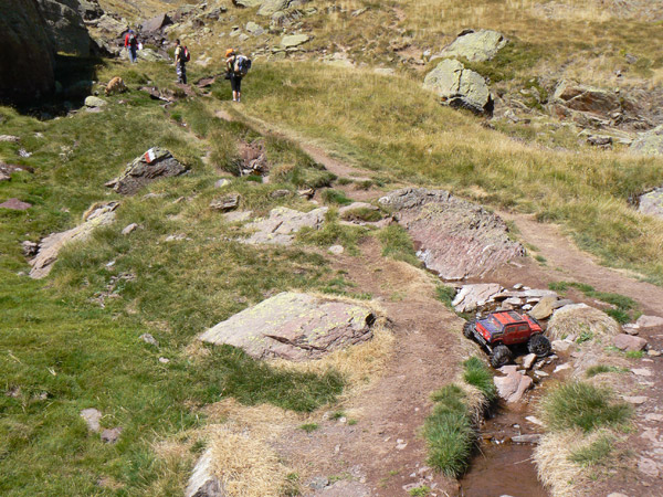 Interferencias , y van 4. Otra caida Cuarta ruta jugándome el coche por culpa de unas interferencias que se producen al acercar mucho la emisora o en cuanto baja un poco la tensión del Receiver. Tengo pedido ya el recambio original y un conjunto de cristales pero decidí arriesgarme de nuevo en esta excursión. No me pareció un itinerario expuesto a caídas y la previsión meteorológica de Soles por todo el Pirineo para este fin de semana fue poco habitual. No se podía desaprovechar . Por una única vez ,tres servicios metereológicos que acostumbro a consultar: Meteo France, Euskalmet y Barrabés, estaban de acuerdo. Este tramo que parece en la foto me hizo acordarme varias veces del receptor Chino de 20 euros que compre para salir del paso .En esta zona no podía llevar al coche muy lejos de mis manos , a lo sumo cuatro o cinco metros y requiere mucha atención, en cuanto me acercaba un poco más se volvía loco ; primero se paraba unos segundos y luego aceleraba a tope , trabajo tenía con desconectar inmediatamente la emisora y parar el coche que ya estaba haciendo un back flip valle abajo. Poco antes de este lugar el coche se despeñó en un paso ascendente con inclinación lateral, que aunque ligera era de levantamiento brusco. No sólo se salió el coche del camino durante la subida sino que al regreso lo hizo exactamente en la misma piedra, aunque ya asegurado, Nos llevo 15 minutos a mi mujer al chaval y a mi encontrar las baterías que se desprendieron durante la caída, de unos 15 metros de desnivel y unos cincuenta de recorrido. Si os ocurre alguna vez esto debéis dejar una marca en el punto donde inicia la caída, por ejemplo la mochila y bajar por el mismo sitio donde ha trazado el coche. No mover el coche de sitio hasta comprobar que esta todo, así si falta algo tenéis dos puntos de referencia origen y fin de la caída y es más fácil encontrar algo. |