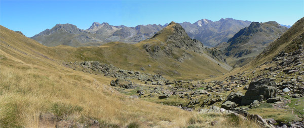 Vuelta al Ibon Durante toda la vuelta no tienes tiempo ni ganas de fijarte mucho por donde anda el Emaxx es tan grande y llano que prácticamente puedes andar a 1/4 de velocidad sin mirar por donde va. El paisaje mires por donde mires es impresionante. Así despistando me fui acercando a una de las muchas escorrentías que se acercan al lago y al estar ya metido medio coche dentro decidí continuarla. No eran más de 4 metros pero la salida fue un poco dificultosa. A pesar de haber cambiado recientemente otro pack de baterías no le fue fácil salir de aquí, acelerador a fondo para apenas girar las ruedas, sin ambos diferenciales bloqueados dudo que hubiera podido salir por sus medios. De hecho si la trasera izquierda hubiera llegado a hundirse tanto como la derecha los bajos habrían quedado encima del barro complicando la cosa. Venga, otra panorámica hacia el Este que quiero recordar durante mucho tiempo.