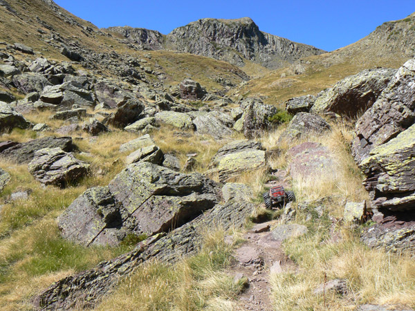 Venimos siguiendo desde el parking de Anayet en la estación de esquí las inconfundibles marcas de GR que en esta parte de su trazado nos llevaría de Formigal a Canfranc por el collado de Anayet, la Rinconada y Canal Roya. Hay un cacho de unos 100 metros de este camino que cruza de nuevo del margen derecho al izquierdo del Culivillas y que difícilmente podremos superar con el Emaxx a menos que nos tiremos media mañana buscando pasos de trial accesibles. No me corto, coche a mano y para arriba ya hemos perdido demasiado tiempo desayunando en Biescas . Poca paciencia. Luego de repente la pendiente aumenta pero es fácil, tiene piedra pequeña y no desliza demasiado. Poco a poco vamos ganando altura, aunque el altímetro parece clavado en 2000 metros y parece no querer girar más. Mi hijo no hace más que preguntar cuanto desnivel falta. Cada veinte metros claro, para eso es un niño. Y como no le puedo decir que hace rato que faltan 200, le voy contando 199, 198 ...