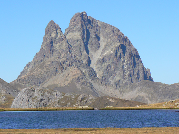 El Midi D`Ossau . 2884m de altitud , ninguna via que yo conozca para subir andando tranquilamente , aunque si con dos pequeñas chimeneas de escalada poco dificil. En esta imagen tomada con zoom optico 10X aparece cercano al lago, pero esta unos cuantos kilometros más al Norte .Al Sur del valle frances D'Ossau como su nombre indica. Sólo una vez , años atras, he intentado subir este pico desde un pista cercana al Portalet . Una de las pocas veces en que el sentido comun gano a las ganas de subir e hicimos caso al mal tiempo regresando sin ni siquiera intentarlo . No es un sitio para jugar al escondite con las tormentas que suelen montarse muchas tardes de verano, te coge con toda seguridad.