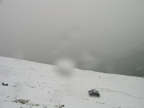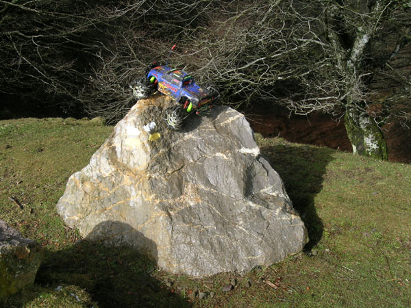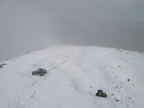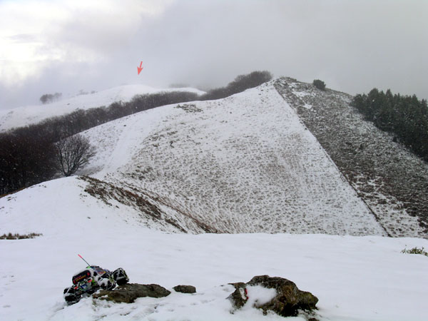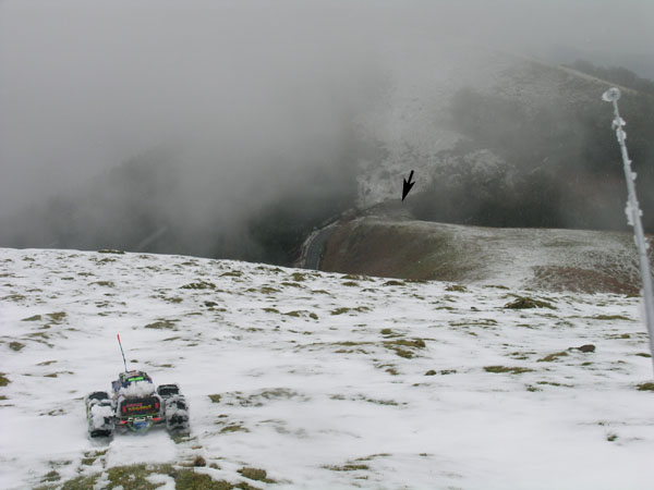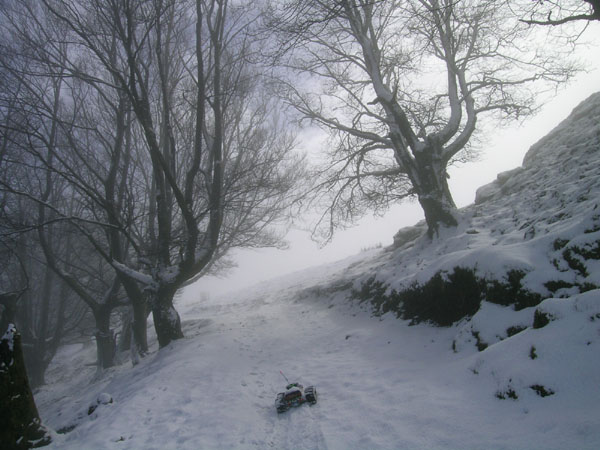 Me siento un poco raro aqui arriba, en medio de la nevada, con un monster truck de RC. Un poco mas alto o en el mismo sitio - no recuerdo- , pero aun en la primera pendiente que se veia en la foto anterior, arrecia la nevada y dudo en sacar la camara de fotos de su funda. Tambien pienso si no seria mejor regresar ahora abajo antes de que se empiece a liar la cosa y me encuentre a una hora de camino. No se puede ir cara a la nieve y a contra viento , es mejor ir ladeando y buscando giros suaves . Algun escaloncillo pone un poco en apuros la primera marcha, por ser demasiodo corta ( 12-72 en esta ruta) y no conseguir bastante velocidad. La segunda se queda un poco larga y va demasiado rapida para este tipo de subida y para mis patas, no puedo seguir su ritmo de ascension en 2ª |