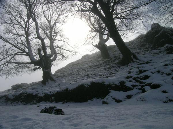 Fin de 1º pack y de 1ª nevada. Se acaba el primer pack, llevamos 25 minutos subiendo, nevando y por fin parece que va a mejorar el tiempo , aunque luego en la cima volveria a ello con peores y oscuras intenciones . Apenas cien metros atras ya no hay visibilidad . Aun hay poca nieve , uno o dos cm solamente en esta zona , pero parece que la hayan echado de golpe en esa media hora con una enorma pala. Si no fuera por ese guante casi se diria de una foto en blanco y negro. Esto parece que ya es "arriba" pero no, todavia queda un buen trecho. |