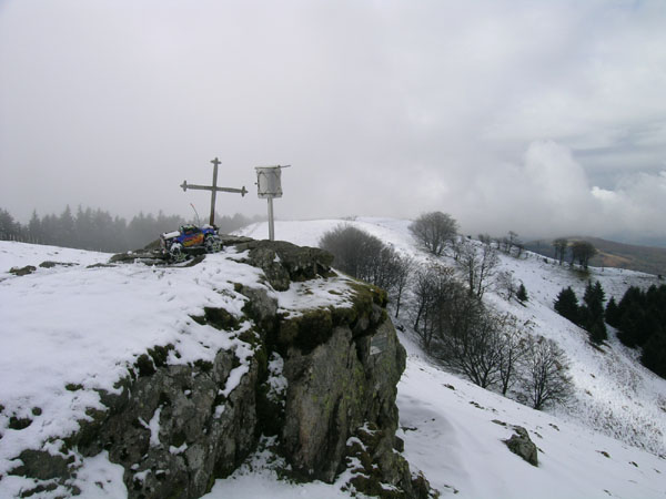 Arriba. Tres lomas despues del bosque se llega a esta pequeña cruz ya muy cerca del punto mas alto de Bianditz, en la que hay un vertice geodesico importante. Antes habremos pasado muy cerca de un momumento megalitico. Se han consumido casi 3 doble packs Todavia da tiempo - y bateria- para continuar un buen cacho, sin embargo se va el sol y se aproxima otra vez nieve. Me parece, solo me parece oir algun trueno. Segundos despues ya estoy de regreso. Y mas rapido que lo habitual. Baje estos primeros trechos tan a leche que ni siquiera tuve tiempo de averiguar si desde arriba habia oido en la lejania un trueno o un avion .