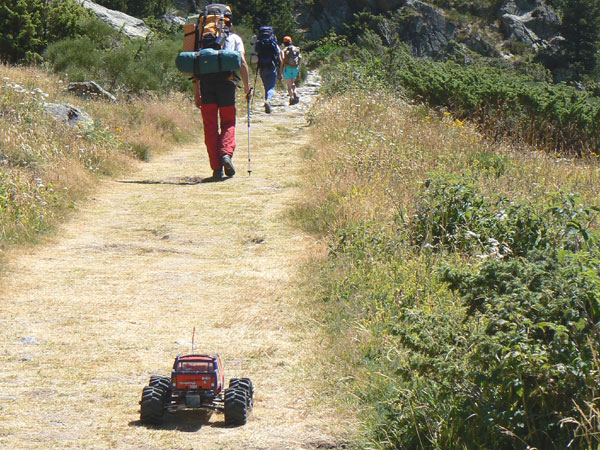 Un poco de escalada a lo crawler? Por supuesto, no hay piedra pequeña que no anuncie otra más grande a continuación , estamos a unos dos mil y pico metros de altitud, nos encontramos con este tramo y no vamos a retroceder. Vaya, que arrastro el Emaxx con mis dientes si hace falta. Es difícil incluso después de haber caminado con el Emaxx a lo largo de 32 rutas de montaña decidir cuando debes seguir y cuando no, prever cuando el sendero va a ir a peor o cuando es un paso aislado. Que yo recuerde solo en dos ocasiones he tomado la decisión de abandonar una ruta en mitad de la subida una fue en la excursión del verano pasado por el valle de Remuñe al encontrarme con rocas del amaño de vacas y desprendimientos de carrizal. La otra a menos de cien metros de la cima de la montaña Petrechema por miedo a un vuelco lateral y caída en picado de más de 200 m. En esta ocasión decido seguir para adelante, hace buen tiempo.., debemos estar a punto de llegar, voy sobrado de baterías. Cualquier excusa es buena para convencer que haces lo correcto. Pues eso, primera y tranquilo para arriba, mejor por piedra todo el rato que intentar subir los escalones