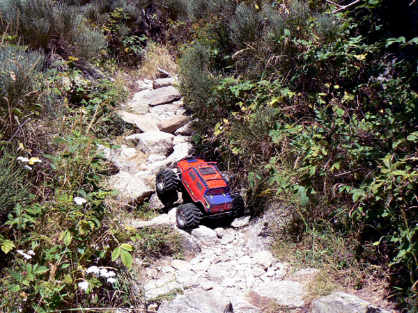 Luego piedras un poco mas grandes Como comentaba en la anterior imagen, se pasan las piedras por la vía más directa siempre que la inclinación no haga volcar al Emaxx hacia atrás. Todas estas subidas se preparan antes de salir del parking bajando la suspensión delantera y endureciendo la trasera. En este momento llevaba un anillo grueso de precarga en dos de los amortiguadores delanteros y dos anillos gruesos de precarga en cada uno de los 4 amortiguadores traseros. Eso es con muelles Integy rojos de dureza mediana, amortiguadores en posición 1B, aceites silicona 30/40 delante/detrás y cuerpos Bigbore de Traxxas. Con este Setup se consigue mantener la parte trasera del chasis alto y firme y la delantera blanda y más baja. La propia inclinación de la subida tiende a compensar esto cargando más peso en el eje trasero y manteniendo una altura suficiente delante. Probar siempre las suspensiones con las baterías puestas, un doble pack de NiMh puede añadir 700 g de peso y disminuir la altura libre.