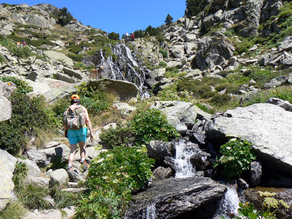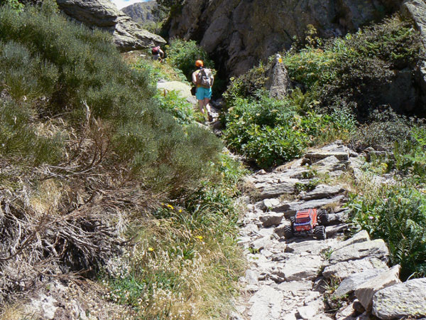 Sera por ahi, por la cascada? , Sí. Si nos fijamos bien en esta foto veremos además de la espectacular y fresca cascada 4 puntos de referencia a lo largo de la subida: Mi compañera, el perro, dos excursionistas algo más arriba a la izquierda y otros dos en lo alto de la cascada. Indican claramente el camino a seguir en los próximos cuatro zigzag. Parece complicado verdad?, pues lo es. Dejando aparte un par de escalones de medio metro en los que hay que tirar el Emaxx un poco hacia adelante el resto se sube en tres largos tras estudiar bien el recorrido y con frecuentes y cortas paradas para elegir trazada. Afortunadamente el camino es bien claro y está bien marcado en este tramo de fuerte subida , a primera vista mi hijo me indicaba desde un poco más adelante que "iba a tener problemas con el coche" , más que nada para animarme, se que no lo hace con mala intención. Pero al llegar y irme metiendo de lleno en el camino la cosa cambio de problemática a increíble al ver como mi Emaxx superaba los escalones. Y si me sorprendía ahora de lo que estaba subiendo el Emaxx al bajar por aquí unas horas después aun me parecía más imposible y yo más extraterrestre.