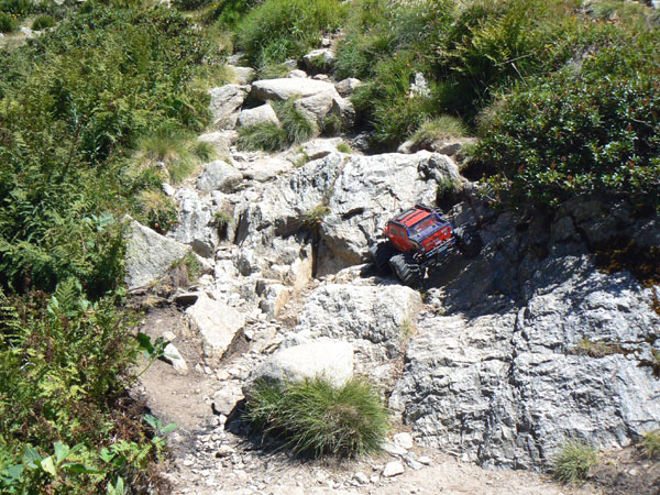 El estrecho paso. El sendero sigue el fondo del valle cada vez más estrecho buscando ese paso al fondo de la imagen. Es una conducción que requiere algo de atención pero que es muy gratificante ya que se pasa muy a menudo por sitios en los que a primera vista parece que haga falta superarlos con el coche en mano. De nuevo los diferenciales bloqueados ayudan a preocuparse menos del trazado y más de la inclinación en los escalones. El calor aprieta y un poco más adelante comprobaré que las baterías están a punto de quemar el plástico termoretractil que las cubre. Quizás debí haber preparado más el coche para calor fuerte, desmontando las laminas de plástico que suelo llevar para proteger el interior del agua y salpicaduras y el protector bajo las baterías que impiden en este momento que se refrigeren bien. Los motores, a pesar de las aletas disipadores que he colocado y del cpu fan , mejor no tocarlos demasiado, no más de 2 segundos antes de quemar. No sé hasta que punto son efectivos los ventiladores internos de los motores Titán pero aseguraría que no son lo mejor de su diseño.