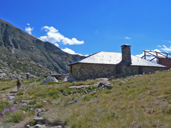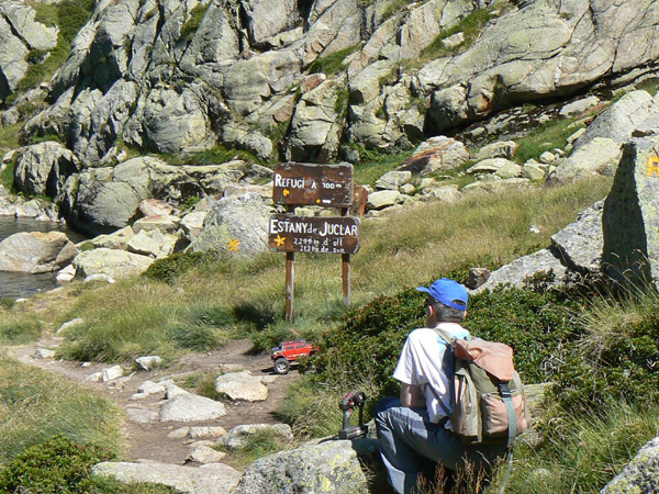 Refugio de Juclar, 2310 m. Este es el nuevo refugio de Juclar, a 2310 m de altitud , un poco a espaldas del lago que apenas se ve desde esta posición . Llegar desde él hasta aquí es un paseo de cinco minutos . Aquí aprovecharíamos para comer, rehacer un poco las mochilas y casi con toda seguridad olvidarnos el teléfono móvil tirado por el suelo , que si estaba en la mochila cuando iniciamos la ruta y no estaba al llegar al camping , aun lo estamos rebuscando entre los trastos aunque con muy pocas esperanzas. Por suerte era un celular de tarjeta de los más baratos, de los de 30 euros . Consejo: si tienes uno de esos celulares con Bluetooth , Mp4, Gprs, Cámara de 5 Mpixels , 2 GB de memoria , servicio de cafetería en espera , orquesta sinfónica integrada , de esos que ahora cuestan 600 Euros no te lo lleves a la montaña. No es una excursión para repetir con un coche RC, es muy interesante en algunos tramos pero en otros se hace también pesada y te exige andar muy despacio, se dobla con creces el tiempo de subida normal andando por poco que te entretengas en las zonas más trialeras. La bajada también se las trae, al principio la hacia con la cuerda de seguridad atada al parachoques trasero pero al final termine bajando muchos peldaños con el coche en mano.