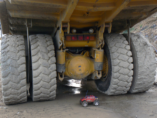 Si hay una bestia en este parking que pueda hacer callar el rugido de los Volvo A40D es esta. Un Komatsu HD 465 que llega a pesar 100.000 Kg cargado, lleva un motor de 23 litros y que da 715 HP necesarios para mover semejante masa. Hace pocos dias la oí ponerse en marcha y más parecía el arranque de una gran maquina de tren que el de un camion. Algunos datos curiosos: Serán necesarios 780 litros (206gal) para llenar el depósito de combustible , 95 litros para llenar cada diferencial y comprar 12 latas de 5 litros si vais a cambiar el aceite motor. El pequeño Hummer rojo funciona con dos baterias de 7,2V en serie y 4200Mah de capacidad alimentando dos motores Titan de 14,4V y pesa poco mas de 5 Kg . Es suficiente con 3cm3 de grasa para rebosar el diferencial . Aunque no lo parezca en esta foto, la carroceria está a escala 1/8, un Hummer a tamaño real apenas llegaría a la parte superior de los enormes neumaticos de más de 2 m (> 6.5 f) de altura.. A pesar de esto el Emaxx casi se queda clavado debajo del arnes de acceso a la escalera de subida frontal de la cabina. El camion estaba cargado con tierra . Soltaba agua de la caja de carga y había formado una capa de lodo muy líquido bajo el motor y la escalerilla . Uno de estos charcos casi se traga al Emaxx hasta el portabaterias.