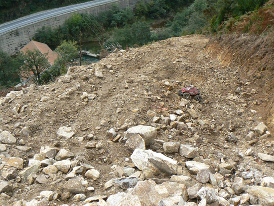 La pista que seguimos desde la entrada del tunel se encarama por la ladera sin contemplaciones, han limpiado roca y el unico objetivo de momento parece ganar lo mas rapidamente posible altura y quizas enlazar con otro tramo que se construya más adelante desde el Norte. Aqui todavia sube sin ningun problema el Emaxx. incluso en segunda si no nos preocupa gastar algo de bateria. El terreno tiene muy poca adherencia ya que hay muchos trozos de tierra fina y suelta que parece desmoronarse sólo con mirarla fijamente unos segundos. Es mejor mantener una subida alegre acelerando en segunda que arriesgarse a quedar derrapando "sur_place" en primera velocidad.