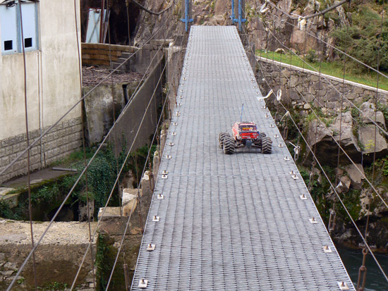 Bajando la la pista del tunel hay una pequeña escapatoria, antiguo camino ahora destrozado por las obras, hacia la central hidroelectrica de Endara . Nada mas verlo me acerco para ver este puente colgante de cerca. Tan pronto llego me echo para atras a la hora de pasarlo con el Emaxx en marcha. No es que no me fie de la emisora pero estando tan cerca de una central y transformadores decido no arriesgarme a una caida al rio del coche. Debí haberlo atado con la cinta de seguridad pero por pereza o comodidad lo pasé a mano, para que vamos a engañarnos. Lo llevé algunos metros en marcha vigilando cada centimetro que pudiera desviarse a uno u otro lado . En la zona central , el puente se balanceaba bastante con mis pasos y entre mirar el coche , el rio el puente y mis pisadas ya me estaba intranquilizando más de la cuenta.