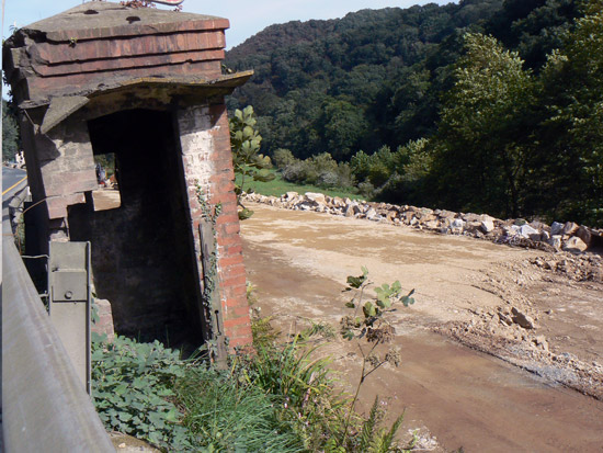 Lo que queda de una antigua garita de guardia o puesto de control a unos 4 Km del puente ya en territorio Guipuzcoano. Es dificil saber no sólo como se mantiene aun en pie sino tambien como se aguanta sobre en terreno practicamente roído por las obras del nuevo trazado que presumiblemente irá por aqui abajo. Aunque solo sea para mirar si sigue en pie cada dia que paso para ir al trabajo me gustaria que permaneciera ahi despues de terminar la nueva carretera . En esta imagen vemos el muro de contencion a base de rocas colocadas cuidadosamente una por una junto al cauce . Se utiliza una una excavadora Lieberrh-924A, dotada de pinzas, que maneja el maquinista muy habilmente para coger las rocas de 400Kg y tratarlas exactamente igual a como nosotros podemos jugar con unos terrones de azucar . Estas piedras son traídas sin cesar por camiones desde el depósito y cargadero que aparecía en la 4ª imagen de esta pagina. * editado: foto tomada el domingo 20 Sep-2007 . el Miercoles dia 3. ya no existia.
