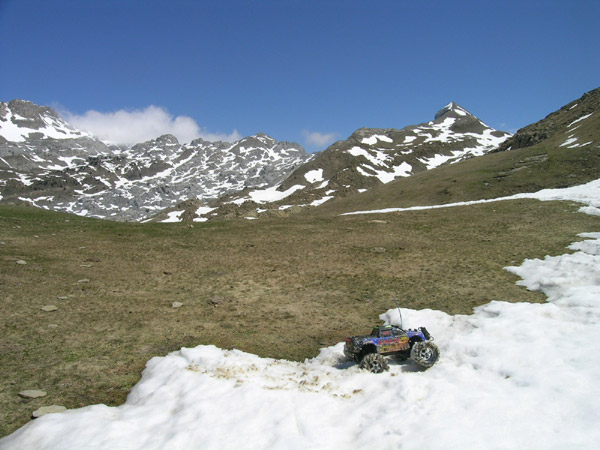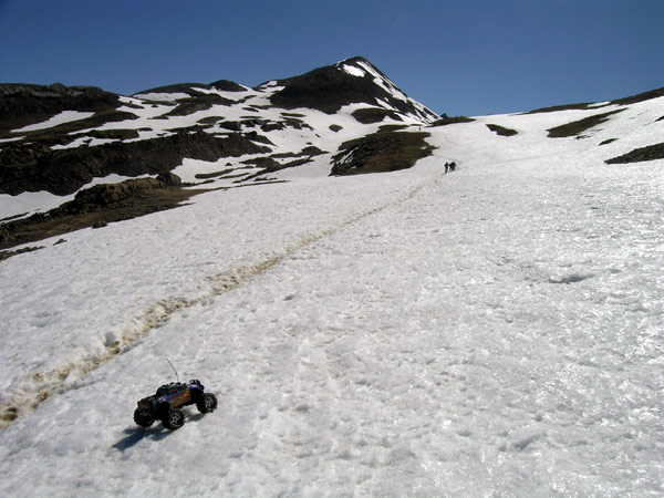 El mismo sitio :Que no tengo mas fotos de la bajada por ahi. No es que hubiera pocas alternativas, es que no habia ninguna aparte de tirarte cuesta abajo directo por la nieve y perpendicular al camino hasta el valle . El haber cogido esa alternativa ahora me habria obligado finalmente a remontar un cacho de valle que desde aqui arriba no se veia nada claro. Asi que esperé hasta perder un poco de altura y entonces si, lanzarme a pendiente maxima por la nieve, directo al collado y evitando el camino embarrado . Salio bien la jugada- Tampoco andaba ya con muchas ganas de parar a hacer fotos y como esta me gusta ahi va se titula : El Emaxx sacando la lengua y terminando de relamer el chocolate con donuts que le han preparado. Despues de media hora en estas condiciones ya estaba pelin mas pesado que lo habitual y algo empachado. Sigo pensando que los neumaticos de Traxxas son mejores en este terreno, y en otros muchos , que los que llevo delante. Ya llevo rato haciendo una conduccion bajo minimos para alargar bateria en el descenso incluso en segunda velocidad para que no retenga y pille mas inercia. No se si os habeis encontrado en una autopista de verdad con 30 Km de autonomia y la gasolinera a 35 Km pero la sensacion es exactamente la misma, aprovechas hasta las estelas de camion para alargar el final, sueltas gatillo hasta que parece una pluma.. Hay que reconocer por lo menos que emocion si tiene . |