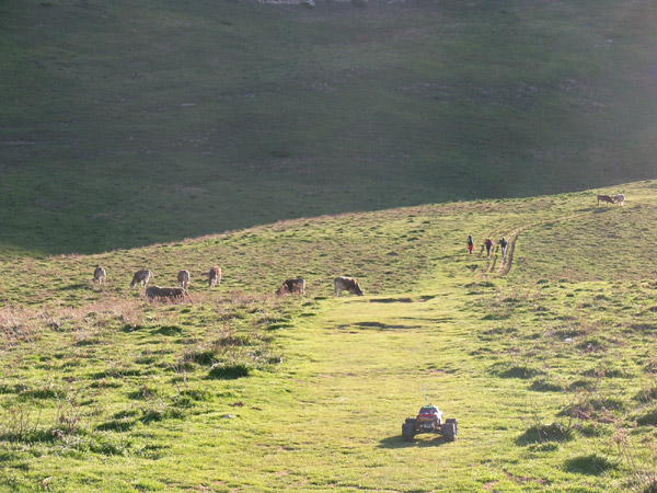 Un Baño. Este riachuelo nace en el llano de Sobrante de Linza, en la cabecera de este hermoso valle que vamos recorriendo . Deberemos vadearlo como podamos en el lugar menos profundo . De momento sera mejor no distraerse demasiado con él porque un palmo a la derecha del coche empieza el viaje a lo desconocido . Lo digo mas que nada porque no es facil imaginar cual de las partes en que se partiria el Emaxx llegaria mas abajo. Asi a ojo hay unos 80 metros de revolcon hasta el rio. A pesar de la experiencia en estas fotos siempre me da un repelus tocar la antena con la mano y / o dejar la emisora en el suelo, se que a veces se le cruzan las ondas para enviar señales suicidas al coche. Una de las variantes del camino, que antes comentaba, va por abajo, por donde el Emaxx, la otra un par de metros mas arriba la estoy siguiendo yo montado encima de estas viejas pero excelentes botas. Justo antes de atravesar el riachuelo llevaremos 35 minutos con el coche y sera necesario cambiar el primer pack de baterias. Estamos a 1600 metros de altitud, casi 300 de desnivel por Pack , algo mas de lo normal. Atravesarlo cerca de su nacimiento en una pradera encharcada no supone finalmente ningun problema, la parte mas profunda apenas llega al eje de ruedas , y con los nuevos rellenos de polietilieno burbujas en los Masher no se acumula agua. |