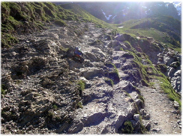 Mira abajo y dime que ves, que tengo vertigo ALUCINANTE. Eso es ya una pasada incluso para mi que llevo algun tiempo haciendo rutas de estas y pocas cosas me echan para atras. Insisto para los novatos en que si pudieramos seguirle el paso al coche, con unas buenas baterias y estando frescos esto se sube a cero en casi el cien por cien de trazado. Fijaros en la inclinacion que lleva el coche y de donde viene.La suerte es que no hay demasiadas piedras grandes, de las de palmo que podrian echar a perder la subida. Son las piedras ideales, apenas desencajan al pasar encima de ellas, buena adherencia y buen tamaño para escala 1/10 y 1/8. Supondria en escala real estar subiendo una cuesta fortisima en primera, reductora y con salpicon de piedras de 30 a 50 centimetros. Aqui se acabo la 4ª bateria y tuve que colocar la 5ª. En ese momento tuve la certeza de que no iba a llegar abajo al refugio con las dos restantes y lo que sobrara de esta. Cada metro avanzado aqui suponia mas rato con el coche a cuestas al final de la bajada y me preocupaba cada vez mas saber en que parte del descenso se iban a terminar . Ademas estos packs que reservo para el final