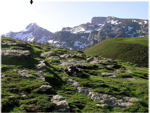 La "Encigalada catalana " otra vez. Aqui si estamos metidos en faena seria :Puede que sea la mas bonita de todas las zonas de piedra que he hecho en mis doce rutas, junto con la del Aizkorri Esto sube desde los casi 2200 metros en que estamos directo al cielo y la cima no es eso ahi arriba donde hay dos tios, ni siquietra cae a la derecha o izquierda, esta justo detras y es aun mas alto. Bastante mas. Esta zona la sube el Emaxx como esperando a que llegues tu y tomes aliento. Se asciende pues a tramos, primero el coche y luego el piloto , pero tienes que pararlo antes de tenerlo tan lejos como para no apreciar bien lo que tiene delante, un cabalito arriba y .... . Se sube en primera y a un cuarto de acelerador (llevo relacion 11/72) , le sobran bajos y control a manta para enfrentarse a todo eso sin inmutarse . Puedes parar donde quieras y reemprender desde cero sin dificultad añadida . Anda rozando ese limite de inclinacion en la que un poco mas de gas en el momento inadecuado lo lleva a una sucesion de vuelcos que si no estas abajo bien cerca y muy pendiente de la posible trayectoria no los paras ni loco. Me encuentro cansado y sin ritmo. Parar ,arrancar, parar , volver a tirar,. pero este lugar y su entorno es de un atractivo tal que bien vale todos los esfuerzos. |