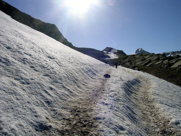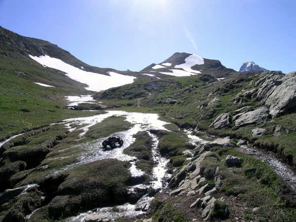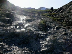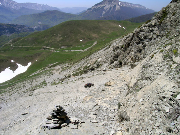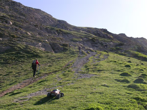 Casi siempre me sorprendo con preguntas como esta No sera eso lo que hay que subir verdad? SI, subiremos esa piramide en el centro de la foto. Estamos a casi 1800 metros de altitud y nos quedan algo mas de 500 . No estamos aun en el collado de Linza , en realidad es ahora cuando comienza la verdadera cuesta que nos llevara al puerto tras vadear ese riachuelo de la foto anterior . El puerto quedaria a la izquierda y atras en esta foto. La pendiente es larga pero muy suave de momento, y no tiene ni un segundo de respiro . Va sobre hierba y placas de piedra muy comodas como podeis ver cerca del coche. En este terreno el coche puede ir y subir muy pero que muy rapido en primera y luego en segunda velocidad , pero conviene ahorrar bateria. Mal rollo bajar 5 kilos de pesimo llevar colgando de un brazo durante mucho rato., mal rollo. Por una vez no hay marcas de pintura GR/PR en el camino, por lo menos no vi ni una desde la salida del refugio , es posible que pasen mas arriba camino de La Mesa, |
