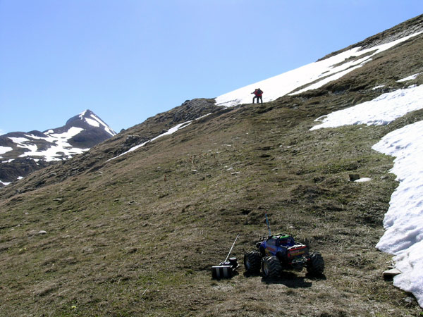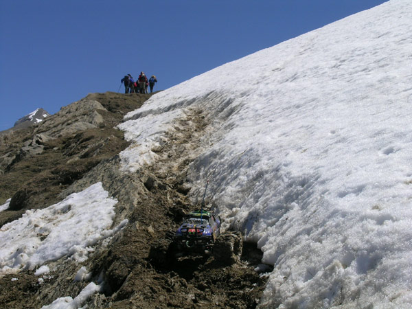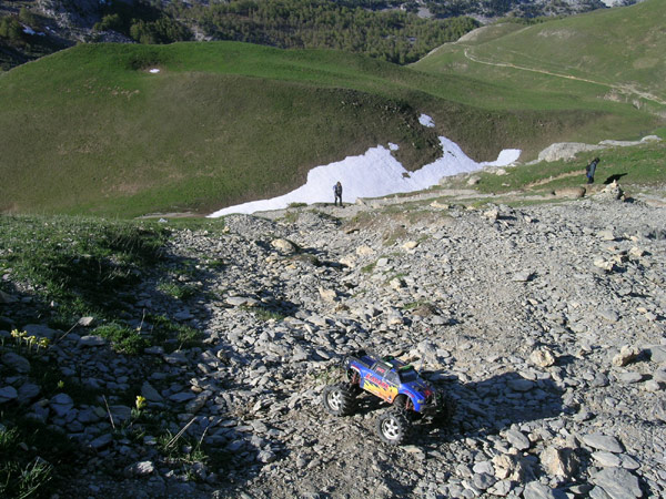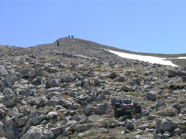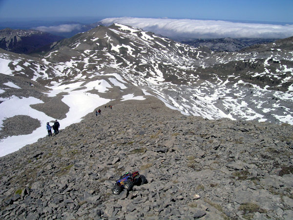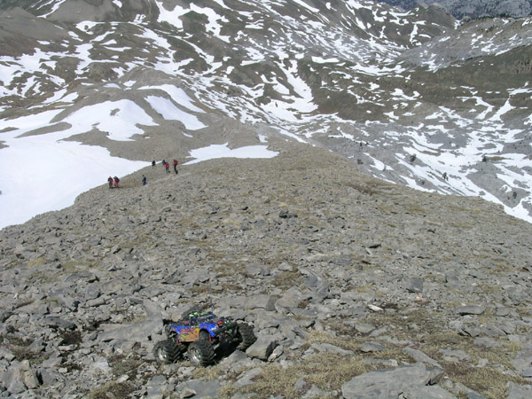 Concretamente los ultimos 150 metros de desnivel por una ladera que mantiene una ensalada de piedras al limite de derumbe entre los 35 y 40 ª es una de las mejores zonas que haya hecho jamas con el coche, va al limite de vuelco tipo back flip y con unas buenas baterias parece que suba solo apoyando el eje trasero. La pena es que no pudes seguir su ritmo de ascension y tienes que ir soltando gatillo antes de tenerlo demasido lejos . O esto o subes corriendo una cuesta de cuatrocientos metros y 35 grados de inclinacion . No andaba yo muy fino ese dia arriba del todo, mas cansado de lo que debiera y sin nada de comida para reponer fuerzas.