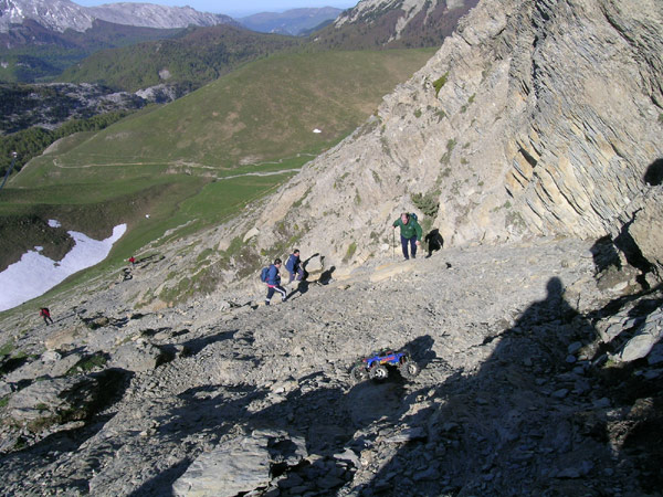 Se caga la burra? Subió la moto de Trial? Perdon por la expresion, pero no se caga. Sube esto y bastante mas, mucho Maxx Si os fijais en el camino ireis descubriendo los puntitos de color , hasta cinco o seis montañeros que estan subiendo el ultimo tramo fuerte del collado de Linza y dan una idea muy clara de la gran belleza y dificultad de esta zona. Si vais por ahi y os sirve de ayuda debeis pasar arrimados a la pared todo el rato, no seguir el camino, no mirar abajo , mejor ir rezando o maldiciendo . El coche siempre muy cerca a un par o tres metros por delante y algo mas arriba. Aunque no es necesario avanzar por turnos debe vigilarse muy atentamente la inclinacion lateral, en esta foto esta bastante al limite, aunque mas o menos controlado. Hace años estuve solo por aqui con mi moto de trial investigando el paso del collado. Hasta mitad de esta pendiente fue posible aunque con bastante remo y algo de maniobra , la seguna mitad hasta dondce esta el coche ya no se sube sin ayuda de algun compañero - yo por lo menos - y la tercera parte de muro ni me lo plantee, habria que pasar la moto a mano con otros colegas como hemos hecho en muchisimas ocasiones . Puse una cruz en el punto exacto del mapa y me di la vueltaa a buscar otro paso entre valles. |