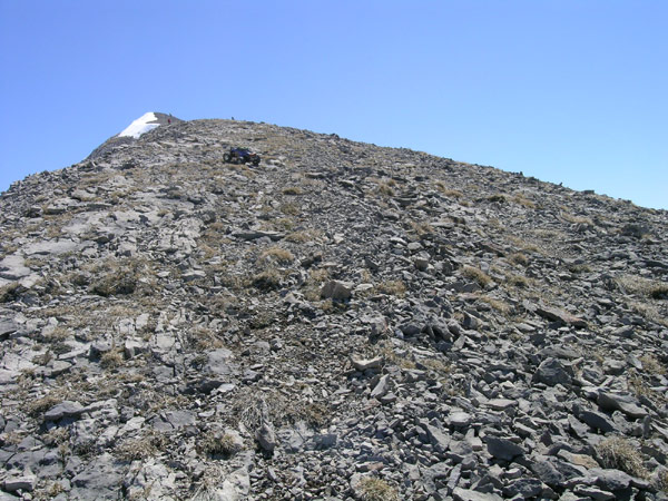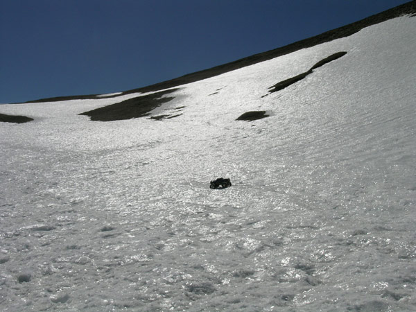 Puedo hacerle unas fotos?. El Regreso. Decidido lo que tuve que decidir -y de verdad enormemente satisfecho de haber visto y acariciado la cumbre- inicio el regreso. Empiezo a pensar como colgar el coche una vez se agote la ultima de las 7 baterias, dentro de hora y media de descenso aproximadamente. Por la cuenta que me trae tengo calculadisima la autonomia restante. La gente se para y hace corrillos para ver como baja el coche por ahi, me preguntan si pueden sacar fotos . ¿porque? , eso se pregunta? . No lo entiendo y me hacen sentir un poco incomodo , solo un poquito :o) Por supuesto que el camino no es nada evidente en este mar de cantos , Dios que de piedras hay aqui. Va un poco por donde tu quieras que vaya. Asi como durante la subida parece haber cierto acuerdo en cuanto a la mejor opcion entre los montañeros que han pasado , la bajada es mas caotica y no se ve nunca una ruta clara y bien trazada. Asi que paras, echas un vistazo y sueltas gatillo con muchisimo cuidado . Puede hacerse casi toda esta bajada yendo el coche por delante pero hay algun trozo en que es mejor adelantarse a el y hacerlo bajar poco a poco. Abajo y al fondo un poco a la izquierda esta el puerto, sube aun bastante gente por la pedriza y hay por lo menos dos mas en la primera mancha grande de nieve que cruzaremos despues del collado Oeste. Ni que decir tiene que esto se baja muuuy despacito, reduciendo y frenando a tope pero sin llegar a detener el coche, ahi es cuando el peso hunde la parte delantera , baja la suspension y el eje trasero te enseña el diferencial una decima antes antes de adelantar en el vuelco al servo de direccion . |