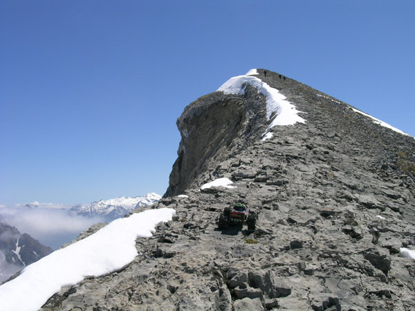 La cumbre a 50 metros de desnivel. El coche estuvo ahi esperando un buen rato solo que esta vez no aprete el gatillo . Otra vez mis dudas poniendo en la balanza el riesgo controlado y la temeridad. Puede subirse, y no es dificil ya que la pendiente media es menos pronunciada , no supera los 35º . Lo que no tenia tan claro es que yo despues haber subido ya 1000 metros , agotado y gastado 5 baterias y pico tuviera animos para forzar un poco mas el limite . Con el coche a 10 metros de la cornisa de nieve sabes que no va a caer al precipicio, pero por otra parte solo que levante el lateral izquierdo un par de centimetros empieza a volcar por la derecha y no lo paras ni de casualidad . Si impresiona subir a pie, imaginatelo mirando un coche fijamente delante tuyo y con las dos manos en la emisrora. Yo ya llevaba un buen rato con esa tension y no me disgustaba . Para mi , seguir a partir de aqui teniendo la certeza de que puede alcanzarse la cima en cinco minutos pasa un punto del riesgo que estoy dispuesto a asumir y deja un margen de seguridad demasiado pequeño para lo que debe ser pasarlo bien y disfrutar de un hobby. No hay excusas por mas ciertas que sean sus razones : ni falta de bateria ,ni cansancio, ni inseguridad . Se mezclan ilusion, fuerza, respeto, precaucion y acojone ahi delante , cada uno que lo llame como quiera y luego que suba hasta ahi a probarlo y me cuente si fue mejor alcanzar cima arrimado a nieve o un poco mas a la derecha . |