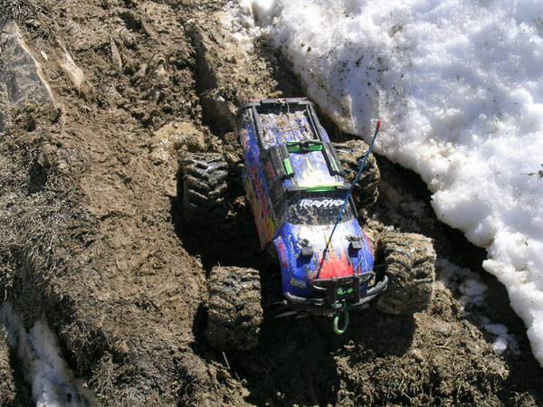 El Barro. Donde habia nieve helada y finas huellas a primera hora de la mañana el sol tambien quiso dejar la suya y poco mas tarde se armo este pastel de chocolate y nata . Esta imagen esta tomada bajando del segundo al primer collado del mapa , muy arriba aun a unos 2000 metros y con el 6º de los 7 packs a menos de 3/4 de caapcidad . Nos quedan 700 m de bajada, y no recuerdo donde lei que el variador electronico de Novak carga algo las baterias cuando estas en una bajada frenando, pero daria cualquier cosa para que fuera cierto. Este barro que se forma aqui es el mas pegajoso y resbaladizo que puedas echarte bajo los pies. Una pisada aqui hace que te lleves pegado a la bota una rebanada de uno o dos dedos de espesor y que en la siguiente zancada te lleve el pie hasta donde le apetezca . Luego ya andas escarmentado y te cuidas muy bien de como apoyar la pata pero del primer aviso no te libras, y no siempre airosamente. Ni siquiera es facil quitarte el barro pisando hierba o nieve , al final acabas rascando las piedras con la suela . Pero bueno, tambien tiene su emocion. Un poco mas arriba tuve que esperar a que pasara esa procesion, lo menos una docena de tios y tias y mientras cedia el paso estaba estudiando como tenia que bajar hasta aqui sin tocar el coche. El paseo por esta piedra justo detras del Emaxx con mas de media rueda en el aire fuera ya del borde y el otro lado en la nieve a tope de inclinacion fue muy lenta pero salio bien.