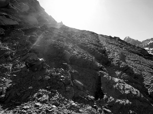 Escapatoria. Esta foto esta tomada a mi espalda en foto anterior, es el final de la cuesta, que queire despedirse bien, para que la recuerdes durante mucho tiempo. Ni yo mismo termino de entender como puede un coche Rc pasar esto. A esto me referia con el muro , la parte final de la cuesta de salida del valle que no paso con una moto de trial . El sendero termina de momento aqui y reemprende en ese hito de piedras arriba del todo junto a la pared. Disculpar la calidad de la foto que he tenido que pasar a B/N para evitar unos reflejos del sol en la lente. Visto asi parece una pared, pero es que lo es, aunque no vertical claro. No se calcular aqui la pendiente y la inclinacion lateral pero si puedo deciros que yo subi pasito a pasito de no mas de medio metro cada uno y el emaxx a la par , a mi izaquierda y a un palmo escaso de las botas por si levantaba falda y tenia que pararlo . Subio bien con fuerza sobrada y equilibrio mas bien precario. Despues de ese hito aparece otro mundo, estamos arriba en la ladera y solo nos quedara alcanzar , casi llaneando, el paso al otro valle.