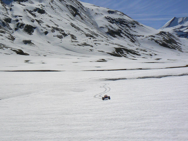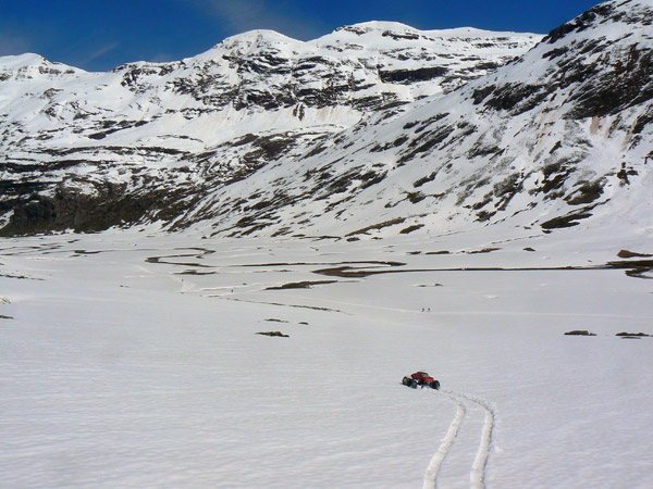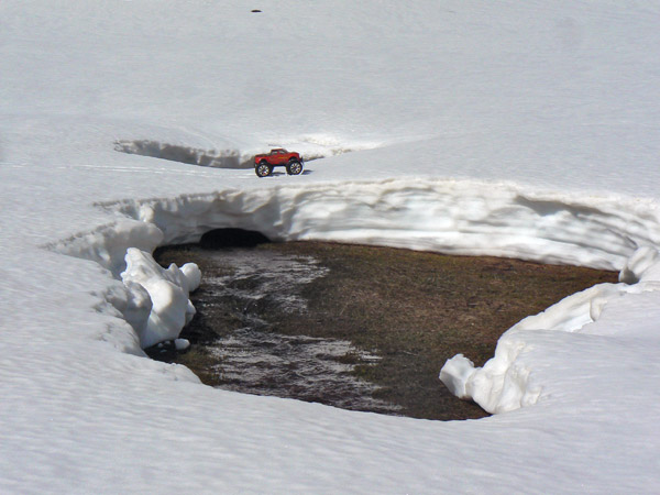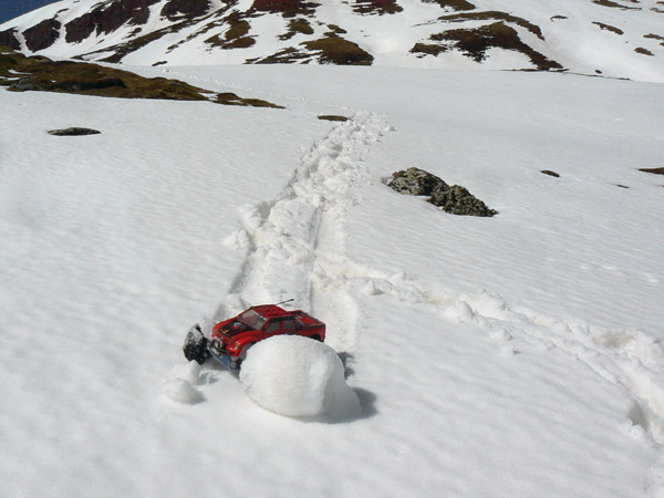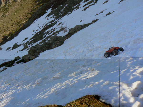 Ya sabia , o por lo menos sospechaba que la nieve en primaver no iba a estar facil para el coche de radiocontrol , se mezclan pequeños derumbes con nieve fundiendo sobre capas heladas anteriormente y la adherencia es cero.