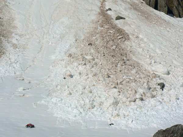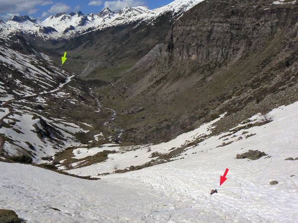 Flecha roja. El Emaxx 3906 baja como puede entre bloques de nieve fundiendo, grumos y montones muy inestables.