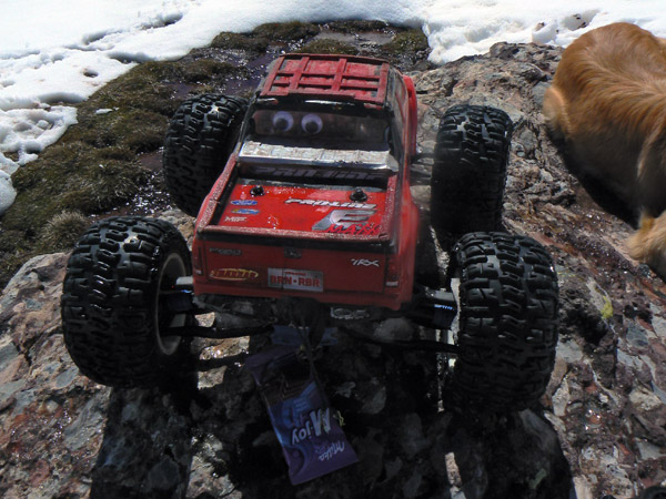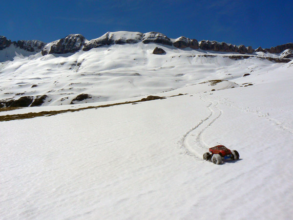 Coche de radio control electrico Traxxas Emaxx 3906 sobre la nieve primavera en Aguas Tuertas, Pirineo Oscense.
