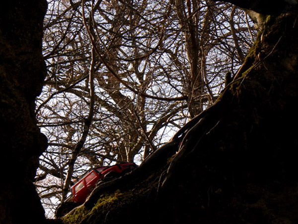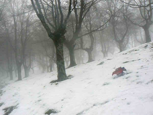 Se me hace raro ver al Emaxx entre la niebla, bajando por este bosque hacia