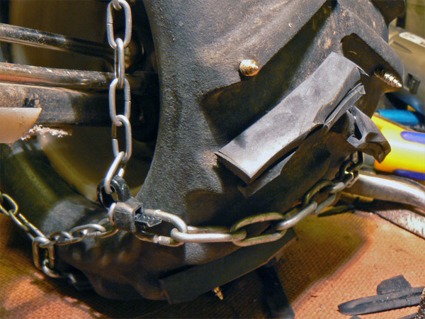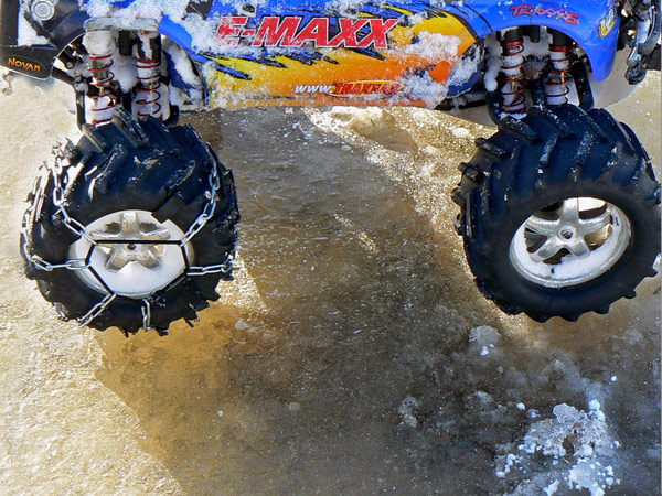 El montaje. ¡Cuidado que pincha! Partiendo de 4 neumáticos originales Emaxx usados, tirafondos de 3*12 mm, un atornillador eléctrico, y las cadenas que hice el año pasado se puede apañar este invento. Hay también unas tiras y ángulos de caucho algo más densos que la goma original pegados con Loctite, algunos incluso atornillados, al nervio. No hace falta que el dibujo sea regular, en nieve da igual no es muy importante . Y sobre hielo es suficiente con que al menos dos o tres clavos estén tocando el hielo. En esta imagen se ven tres tornillos que cuando pasen por abajo y con la deformación del neumático se clavaran en el hielo, al menos eso espero. Pues eso, cuidado que pincha, es muy fácil clavarse alguno durante el montaje de las neumáticos, cadenas o al pegar en las llantas. De relleno lleva las esponjas originales del Emaxx pero muy recortadas de forma que el neumático se deforma y aplana al andar. Estas esponjas originales tienen una calidad superior a otros fabricantes, pues incluso en contacto prolongado con humedad dentro del neumático no se pudren. |