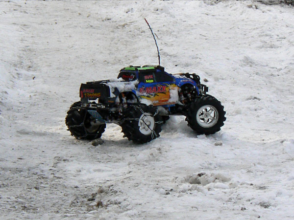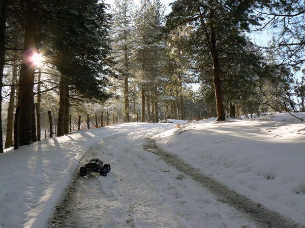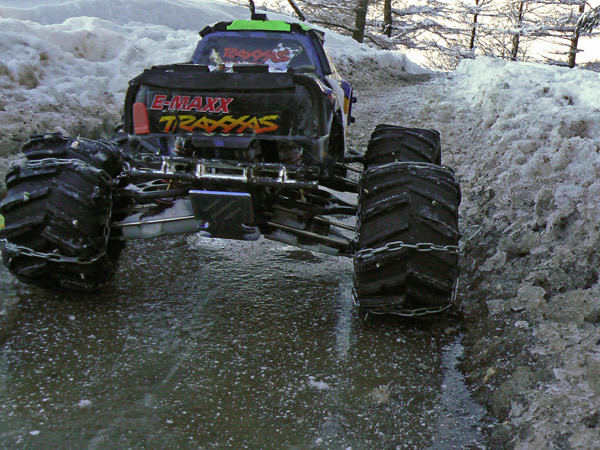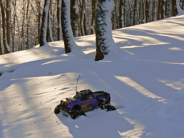 Nada que hacer aquí con un monster truck RC. Quizás por ser zona dentro del bosque, a pesar de estar a 5 ºC bajo cero la nieve no termina de endurecer. Forma pequeños cristales pero muy poco consistentes. Si tiramos el Emaxx desde medio metro de altura y se nos queda así ya podemos ir dando la vuelta. No hay nada que hacer. La bajada es mucho más sencilla, intentaré entrar en una pista forestal que se que suele tener hielo y tiene alguna rampa interesante. |