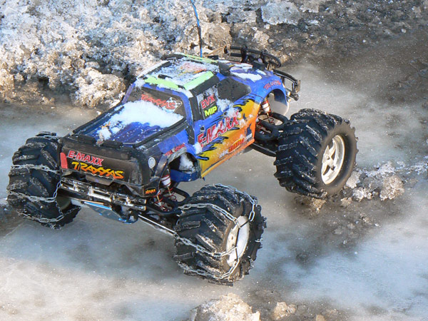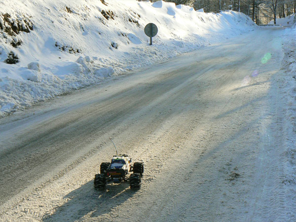 Derrapadas . Si es que no pude tenerme, yendo por la pista forestal hay que cruzar esta carretera que más parece una pista de patinaje que cualquier otra cosa Es una mezcla de hielo nieve y sal. Ideal para la electrónica del Emaxx. Luego ira a la ducha, ah ah. Aquí se trata de acelerar a fondo, llegar a la curva, quitar gas girar en redondo y vuelta acelerador a fondo de nuevo. Más o menos culeando un poco pero bien. Aquí si se notan y mucho los clavos, sería imposible acelerar decentemente por aquí sin clavos o cadenas. Bien. Vamos para arriba, ya hemos perdido casi una carga completa en esta pista de patinaje. Se paró súbitamente un motor. Misterio. No respondía al acelerador. Me temía lo peor, una avería en el ESC o en el receptor a causa de las sales y demás productos que echan en las carreteras para disminuir la temperatura de congelación del agua. Sí. Causa: una gota de agua salada entre los dos cables, algo pelados de aislante que salen del pack izquierdo. Me di cuenta al cambiar ese pack por otro para probarlo. |