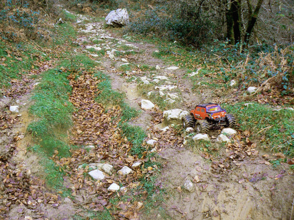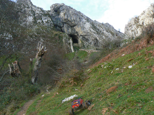 La primera parte del recorrido, desde la pista de tierra hasta la cueva y paso de San Adrián nos llevara como mucho media hora dependiendo del estado del suelo, el 95% lo hace el Emaxx sin ninguna ayuda y algunos pasos cortos necesita un poco de apoyo. Si juntamos el agua con esta tierra y algunas piedras lisas tenemos la combinación perfecta para pasarlo bien con el coche. En esta foto un tramo, de los muchos que hay así, particularmente traidor. No fui capaz de subir con mis botas por donde anda el Emaxx, tanto era lo que deslizaba que ni siquiera te dejaba clavar el canto para apoyar, nosotros andando por aquí debemos coger la variante que se ve a la derecha. El coche resbala un poco pero manteniendo una marcha de más o menos 1 metro por segundo sube zigzagueando y manteniendo la tracción suficiente para llevar su peso hacia arriba |