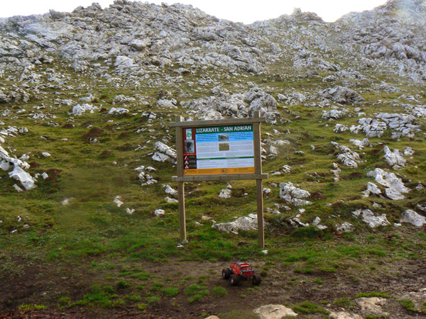 Tras el tunel. Tras pasar el túnel de San Adrián que tendrá unos 70 metros de largo por 20 de ancho, nos encontramos en otro planeta, verdes campas y roca caliza una vegetación muy diferente, ambiente y temperatura cambiante. En la salida encontramos este cartel y mapa indicando los itinerarios, es un excelente lugar para practicar crawler con escalas 1.9 / 2.2 hasta la pequeña loma que se ve al fondo, desde ella se puede intentar seguir hacia la derecha pasar por encima del túnel y regresar a este punto. Nosotros continuaremos por la antigua vía romana, con piedras redondeadas y muy pulidas un par de cientos de metros hasta encontrar un desvío a mano derecha, marcado con pintura amarilla. Es uno de las vías normales para subir al Aizkorri