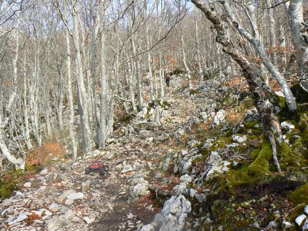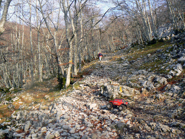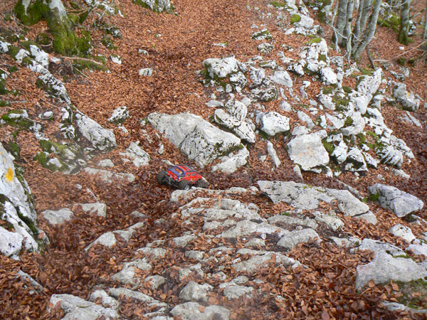 La subida piedras. La segunda parte de esta ruta nos lleva desde la cueva de San Adrián hasta un collado, recorriendo una empinada cuesta por el bosque. Es un tramo en el que estaremos una hora si queremos subirlo sin coger el coche en mano muchas veces. Diría que el 95% lo subiremos manejando el coche en el suelo y que necesitara solo algún pequeño empujón frente a peldaños de piedra más altos. Los Rc Scale mas puristas podéis intentarlo a cero, es decir sin tocar el coche, pero os va a llevar media mañana. La subida que empezamos ahora es larga, hay pasos sobre medio palmo de hoja caída en otoño y la humedad esta presente en cada rincón. Es la cuarta vez que hago esta ruta, la primera se me hizo eterna, la segunda cansada, la tercera ya me empezó a gustar y ahora voy a por ella directamente, es uno de los motivos que me atraen a esta zona. Durante un bien rato estaremos metidos en esta pendiente, algo mas de lo que se aprecia en la imagen, pero llevadera |