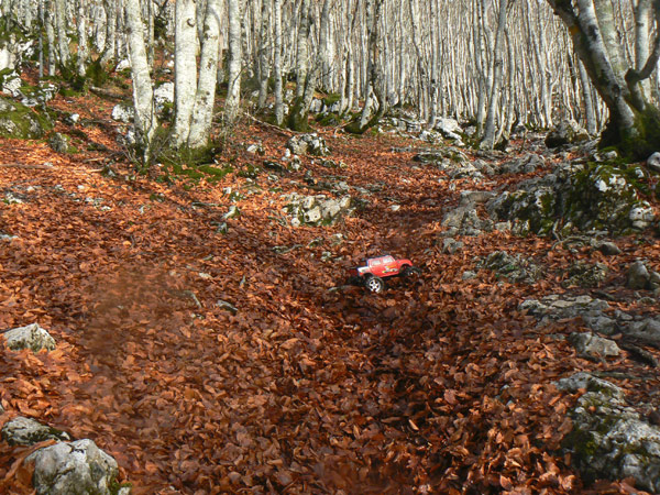 A primeros de diciembre ya no queda nada por caer de los árboles de esta ladera, el suelo esta cubierto por una espesa capa de hojas de haya y roble, repletas de humedad y nutrientes para el suelo de los próximos años. Dependiendo de si están húmedas y de como de apelmazadas será mas o menos fácil andar con el coche sobre ellas, normalmente pasa bien, aplastando un poco pero sin llegar a hundirse, A veces si la caída es muy reciente, las hojas están como flotando y el Emaxx se hunde, pero no se dan muy a menudo esas condiciones. Hay que aprovechar la huella de los que han subido antes y apelmazado un poco el tapiz.