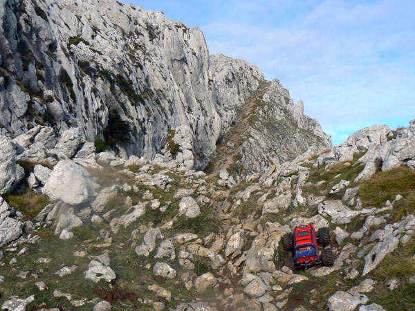 La cuesta del menhir Cada vez que paso por aquí no puedo evitar acordarme de Obelix, si miramos con atención la anterior imagen , veremos esa piedra que esta ahora delante de Emaxx mas o menos a mitad de subida, u poco mas abajo del de rojo. Ha subido muy bien hasta aquí, y va a necesitar levantar hasta arriba de esa roca para reemprender la marcha sin mucha demora. Eso esta realmente muy arrimado a valle, apenas puedes tenerte de pie tan cerca, No es por la estrechez del camino, es que sin duda es el mejor paso para el Emaxx, por el lado contrario, es decir en la pared esta peor.