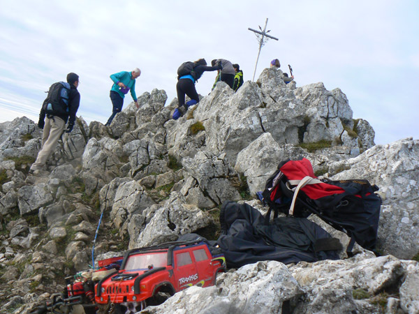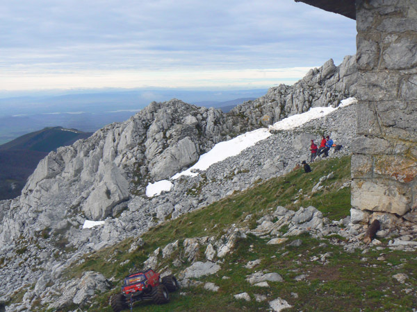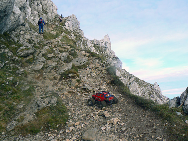 Hasta la mitad bien. Tranquilo y en primera. Delante del Emaxx uno de los puntos que quizás necesiten un poco de ayuda, yo lo suelo probar de pasar a cero un par de veces, y si no cuela lo agarro y lo lanzo un metro adelante. Por la orilla del camino parece poder pasarse, pero eso es muy cerca del borde - por eso llevo al Emaxx atado- y luego se empina aun mas. Uno va subiendo delante de mí y otros dos en la parte alta ya están de regreso. La verdad es que hoy no me he levantado muy pronto, y al llegar al parking en vez de un coche como en la otra vez, me he encontrado más de una docena. Los de meteorología han acertado con un hueco de buen tiempo entre varios días malos, esta despejando, empieza a colar aire frío y paro a abrigarme un poco. Arriba pega fuerte.