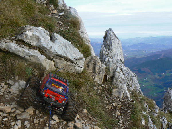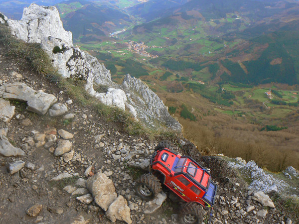 Zegama ? Así a ojo, la verdad es no he mirado cual es la población abajo en el valle así que no me hagáis mucho caso. Más arrimado al barranco el Emaxx que yo. Suele ser así, quizás porque el camino esta menos erosionado, la cuerdecilla de seguridad a punto. Una de las veces que pase por aquí, quizás la segunda, dejé la emisora en el suelo para hacer unas fotos, todo en On, claro. Al ir a coger la emisora lo hice por la antena y por alguna señal el coche dio un brinco hacia adelante, casi se me va para abajo de un salto. Supongo que no debe cogerse la emisora por la antena, ni dejar el coche conectado si no esta bajo control de la emisora.